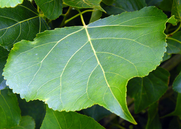 | LIŚCIE | Liście długości 5-10 cm, długo zaostrzone, u nasady słabo sercowate, brzegiem karbowano-piłkowane, nagie. Zwykle występują w gęstym skupieniu. Gdy są młode, mają zielono-czerwonawy kolor, z czasem robią się ciemnozielone, z mocnym połyskiem, spodem jasnozielone.