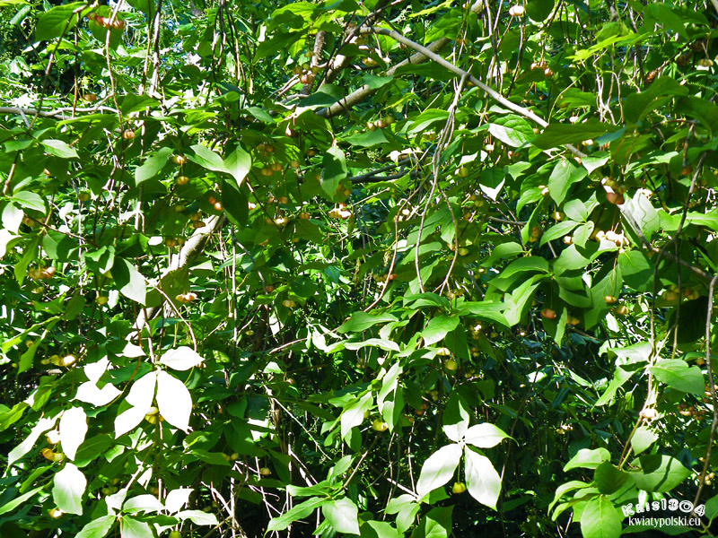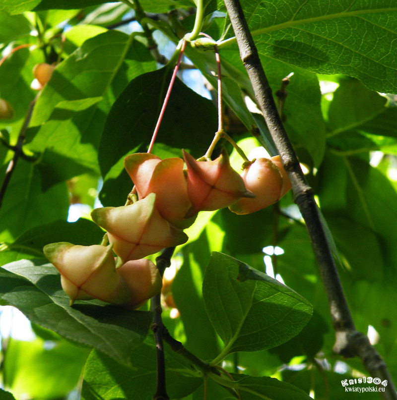 | OWOCE | Czterograniasta, lub pięciograniasta zielonawożółta później czerwieniejąca torebka, zawierająca pomarańczowe nasiona.