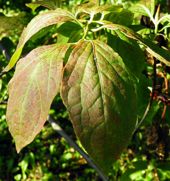 | LIŚCIE | Jasnozielone, naprzeciwległe, eliptyczne, obustronnie zaostrzone. Nerwów bocznych wyraźnie widocznych mają nie więcej, niż 4-5. Blaszki o długości do 6 cm i szerokości do 3,5 cm o nerwacji pierzastej. Ogonek liściowy krótki do 3 mm.