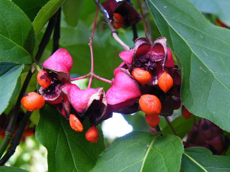 | OWOCE | Czterograniasta, zielonawożółta później czerwieniejąca torebka, zawierająca 3- 4 kulistawe, połyskujące, czerwone nasiona wystające z czerwonoróżowej osnówki i po dojrzeniu zwisające na sznureczkach poniżej torebki.