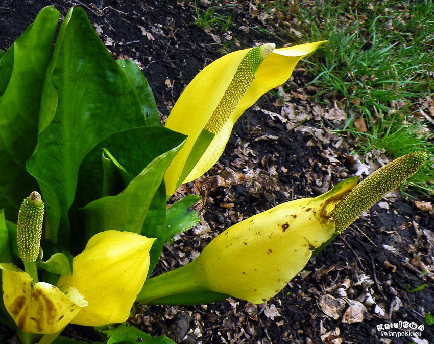 | OPIS | Kilka kwiatostanów, typu kolbiastego pseudancjum, pojawia się razem z liśćmi. Pochwa kwiatostanu w dolnej części tworzy bardzo długą i wąską pochwę o wolnych brzegach, okrywającą trzonek o długości od 10 do 40 cm, na którym osadzona jest cylindryczna kolba. Górna część pochwy jest eliptyczna i łódkokształtna, spiczasta, żółta. Kwiaty obupłciowe, o 4 nierównych listkach okwiatu, gęsto porywają kolbę o długości. Listki okwiatu wąskie, zaokrąglone. Kwiaty składają się z 4 pręcików o płaskich nitkach i główkach oraz pojedynczego słupka o 1-2-komorowej zalążni z siedzącym znamieniem. Żółtozielone kwiaty wydzielają okropny zapach.