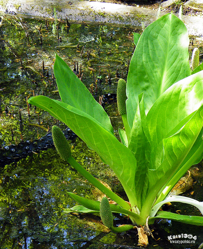 | LIŚCIE | Rośliny tworzą kilka gładkich liści siedzących lub z krótkimi, gąbczastymi ogonkami, pozbawionymi pochwy. Blaszki liściowe skórzaste, całobrzegie, szeroko-lancetowate do podłużno-jajowatych, o ściętej do klinowatej nasadzie.