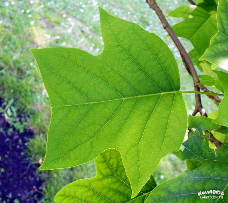 | LIŚCIE | Mają długość 10-15 cm i szerokość 12-20 cm, są wykształcone w sposób wykluczający pomyłkę, w zarysie czworokątne i podzielone na cztery nierównej wielkości klapy, których wzdłużne brzegi przebiegają prawie równolegle do siebie. Liść jest z przodu jakby ucięty albo lekko wycięty. Jego górna powierzchnia jest błyszcząca, żywo zielona, a dolna nieco jaśniejsza i z lekka pokryta woskiem. Jesienią liście przebarwiają się na złotożółto. Ogonki liściowe od 10 do 12 cm długości.
