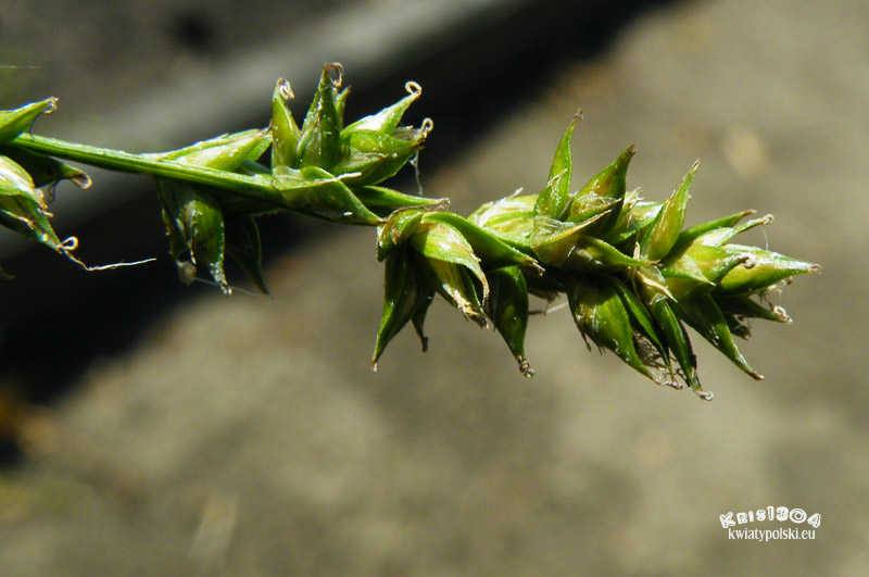 | OPIS | Roślina jednopienna, kwiaty rozdzielnopłciowe, zebrane w kwiatostany - kłosy, wyrastające w kątach przysadek. Kłos szczytowy męski, najczęściej jeden, rzadko 2. Kwiaty męski z trzema pręcikami, ich przysadki podłużonjajowate, tępe, ciemnopurpurowe, z jasną środkową smugą. Kłosy żeńskie u dołu, w ilości od 1 do 3, krótkowalcowate, proste, długości 1-4 cm, siedzące lub na krótkich szypułkach. Kwiaty żeński z jednym słupkiem o dwóch znamionach, ich przysadki jajowate, tępe, krótsze od pęcherzyka, czarne, ze środkową zieloną smugą, biało obrzeżone. Podsadki węższe od liści, dolna krótsza od kwiatostanu.