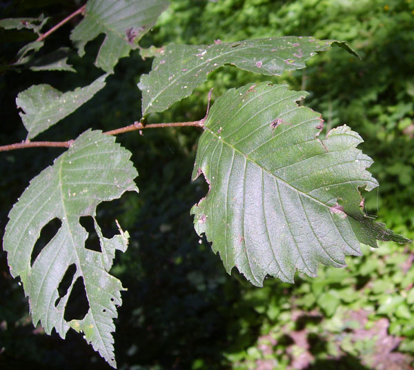 | LIŚCIE | Liście o kształcie eliptycznym lub odwrotnie jajowatym, najszersze powyżej środka, długości 6-14 cm, podwójnie piłkowane, na szczycie nagle zaostrzone. Charakterystyczną cechą tego gatunku jest silna asymetryczność liści u nasady. Z wierzchu liście są gładkie lub nieco szorstkie, od spodu miękko omszone. Ogonek liściowy krótki.
