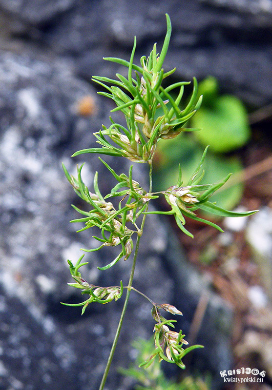 | OPIS | Kwiaty zebrane w rozpierzchłą wiechę. Szerokojajowate kłoski mają długość do 9 mm, składają się z 5-10 kwiatów i są brunatno lub fiołkowo nabiegłe. Obydwie plewy są ostre i mają zgiętą linię grzbietową. Są 3-nerwowe, przy czym nerwy plewki dolnej są na części jej długości, lub na całej długości srebrzyście owłosione.