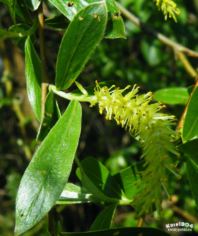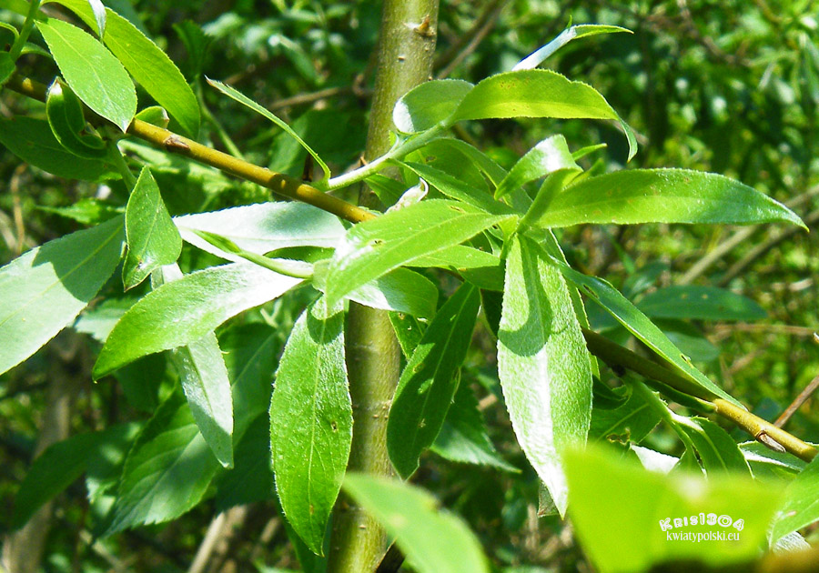 | LIŚCIE | Wąskie, lancetowate o długości około 8 cm. Młode liście obustronnie jedwabiście owłosione, starsze tylko na spodniej stronie. Młode listki są żółte. Latem górna strona liści ciemnozielona, spodnia srebrzysta.