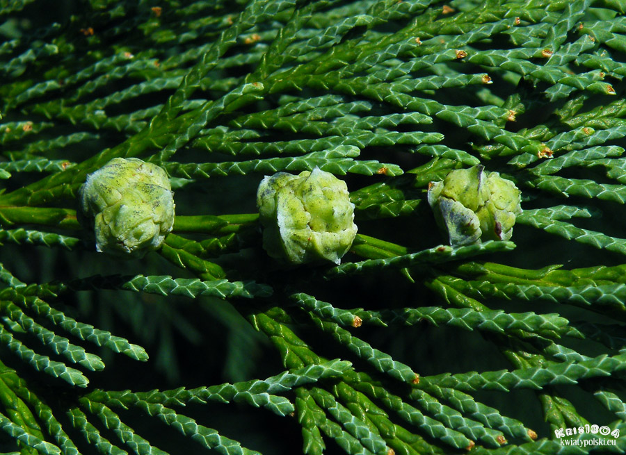 | LIŚCIE | Boczne łuski o zaostrzonych wierzchołkach. Od spodniej strony na krawędziach łusek znajduje się woskowy nalot w postaci białych linii, przypominających dwie litery "Y" połączone podstawami.