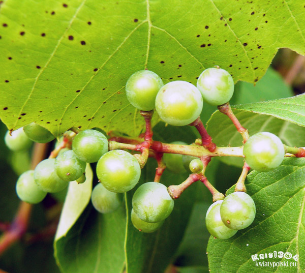 | OWOCE | Kulista lub podłużna jagoda o średnicy do ok. 2 cm. Jest soczysta, słodka lub słodkokwaśna, u odmian uprawnych ma różne kolory - od jasnozielonkawego poprzez różowy i czerwony do niemal czarnego. Zawiera od 2 do 4 nasion. Wytłoczyny powstające przy produkcji wina oraz liście zerwane przed zbiorem owoców są wartościową paszą dla bydła i koni, używane są też jako nawóz.