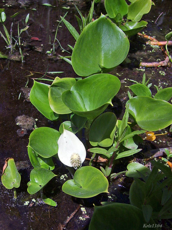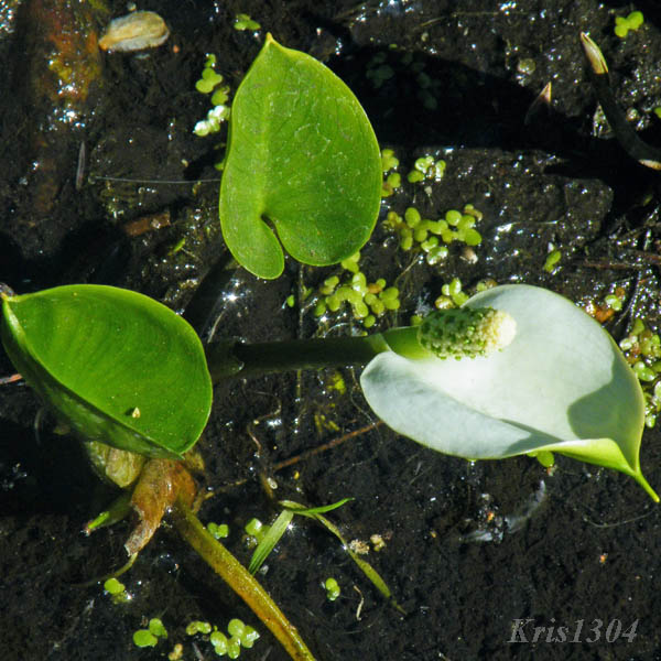 | OPIS | Roślina jednopienna. Kwiatostan typu kolbiastego wyrasta na wzniesionej szypułce o długości 15-30 cm i średnicy 8-12 mm. Pochwa kwiatostanu jajowata do eliptycznej, biała, płasko otwarta, często całkowicie lub częściowo zielona, ostro zakończona kończykiem. Kolba osadzona na krótkim trzonku, cylindryczna, żółtawo-zielona, o długości 1,5-3 cm, całkowicie pokryta obupłciowymi kwiatami.