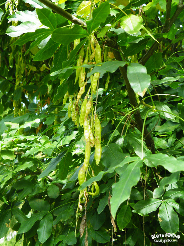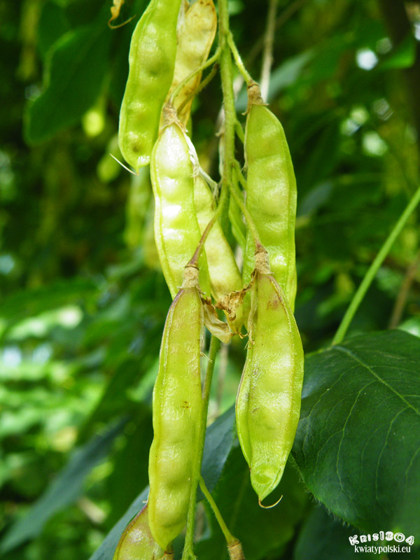 | OWOCE | Strąki płaskie i wąsko-oskrzydlone o długości do 3,5 centymetrów, na jednym końcu wydłużone i zagięte do zewnątrz, wewnątrz drobne czarne nasiona.