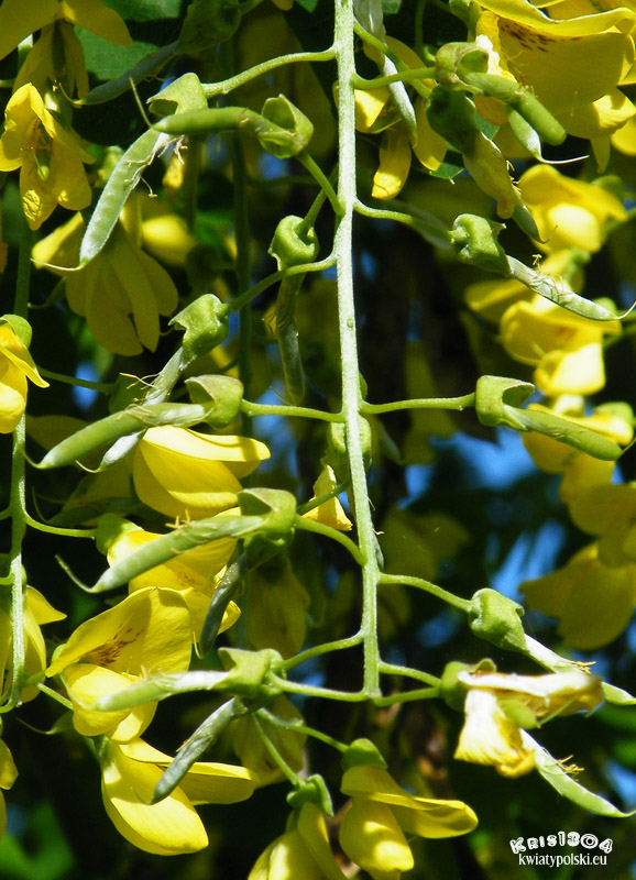 | OPIS | Motylkowe, żółte, do 2 cm długości i tworzące luźno opadające grona do 20 cm długości. Bez zapachu.
