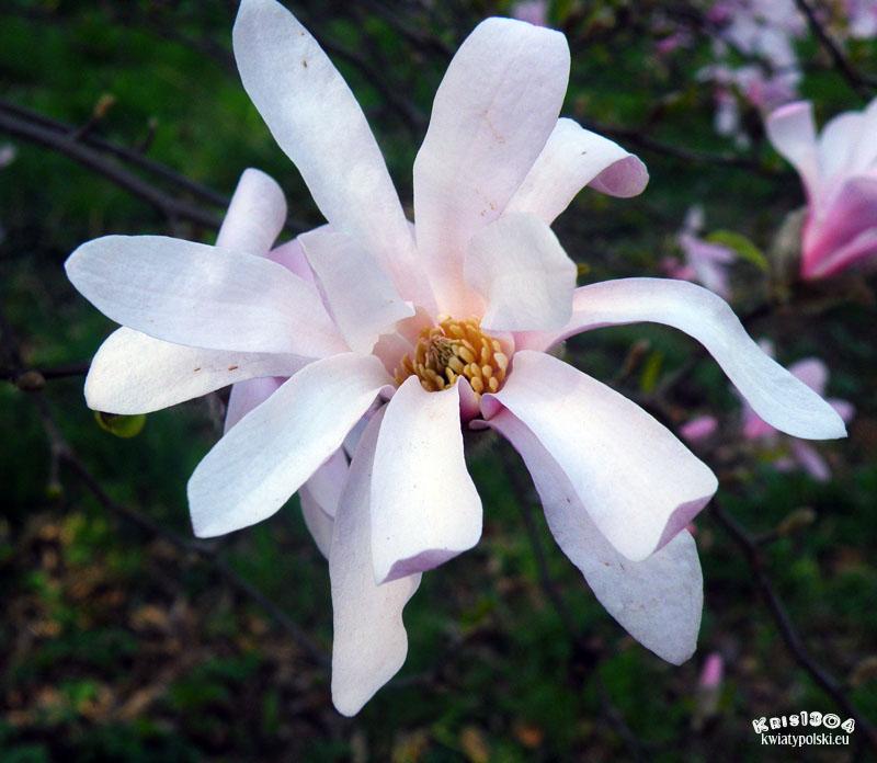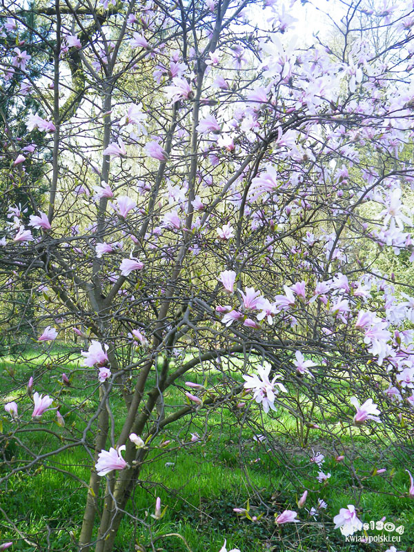 | OPIS | Kwiaty 12 płatkowe, różowe, wewnątrz białe z wyraźnym ciemnoróżowym paskiem po zewnętrznej stronie, początkowo kielichowate, z wiekiem szeroko rozchylone. Kwitnie bardzo obficie w kwietniu. Jedna z najwcześniej zakwitających magnolii.
