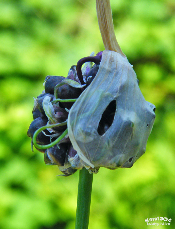 | OPIS | Kwiaty ciemnopurpurowe, zebrane w kulisty, gęsty baldach z dwiema okrywami od niego krótszymi i licznymi fioletowoczarnymi cebulkami. Nitki pręcików wewnętrznych z ząbkami. Cebula kulista lub jajowata, okryta czarniawymi błonami, z bocznymi cebulkami. Płatki z wyraźną linią grzbietową.