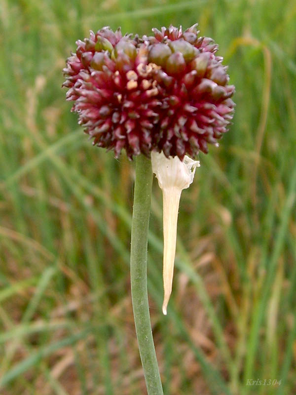 | OPIS | Kwiaty zebrane w baldach pozorny na szczycie łodygi; w baldachu obok kwiatów występują cebulki. Szypułki cienkie, długie do 25 mm. Działki purpurowe lub białawe, do 5 mm długie, lancetowate. Płatków 6.