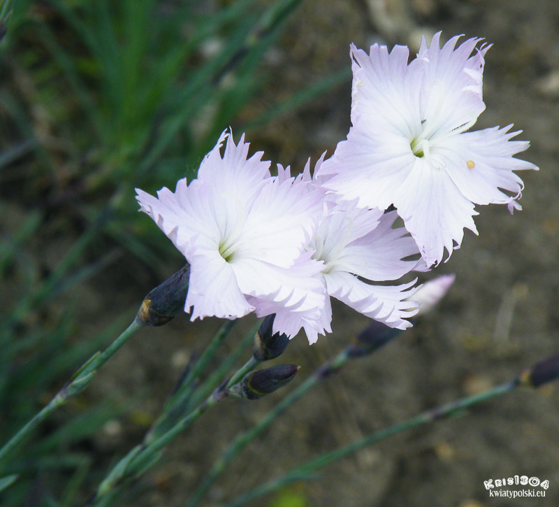 | OPIS | Na łodydze wyrasta jeden lub kilka tylko silnie i przyjemnie pachnących dużych kwiatów w kolorze białym, różowym ,czerwonym i ich odcieniach. Zielony lub fioletowo nabiegły, cylindryczny kielich składa się z 5 zrośniętych działek i jest 2-4 razy dłuższy od łusek podkielichowych. Korona u typowego gatunku składa się z 5 ząbkowanych płatków, wewnątrz niej 1 słupek i 10 pręcików.