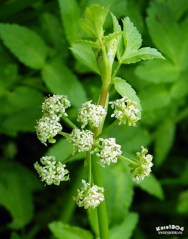 | OPIS | Kwiaty zebrane w baldach złożony składający się z kilku baldaszków. Mają 5 - 7 błoniasto obrzeżonych pokrywek. Baldach jest prawie siedzący z 1 lub 2 pokrywami. Kwiaty drobne, o białych płatkach korony i zielonym kielichu z niewyraźnymi ząbkami.
