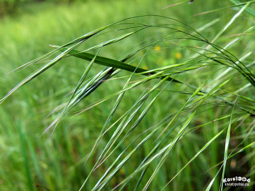 | OPIS | Kwiaty zebrane w 4-10 kwiatowe, płaskie kłoski długości 15-35 mm, w porze kwitnienia i owocowania rozszerzone ku szczytowi, te z kolei zebrane w dużą, rozpierzchłą, zwieszającą się na wszystkie strony wiechę. Gałązki wiechy szorstkie ku dołowi, z 1-2 kłoskami każda. Plewa dolna jednonerwowa, górna - trójnerwowa. Plewka dolna naga, dwuzębna, długości około 15 mm, z ością między zębami do 30 mm długości.