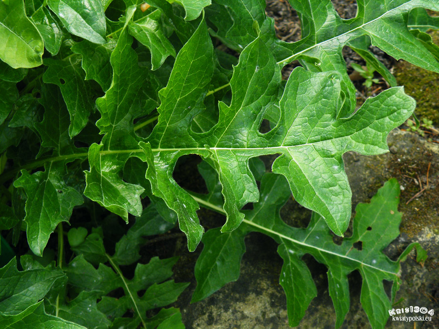 | LIŚCIE | Głęboko klapowane i ząbkowane, ciemnozielone i błyszczące.