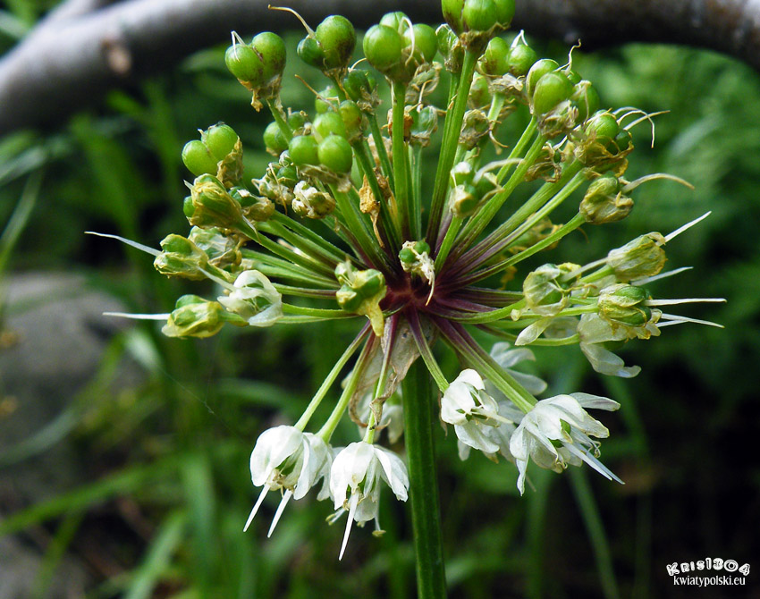 | OPIS | Bylina. Kwiaty zebrane w kulisty baldach, który przed kwitnieniem jest zwisły i nie posiada cebulek. Okrywa baldachu jest tak długa, jak baldach, 1-2-klapowa, biaława. Działki kwiatu białe lub zielonożółtawe. Pręciki dłuższe od działek.