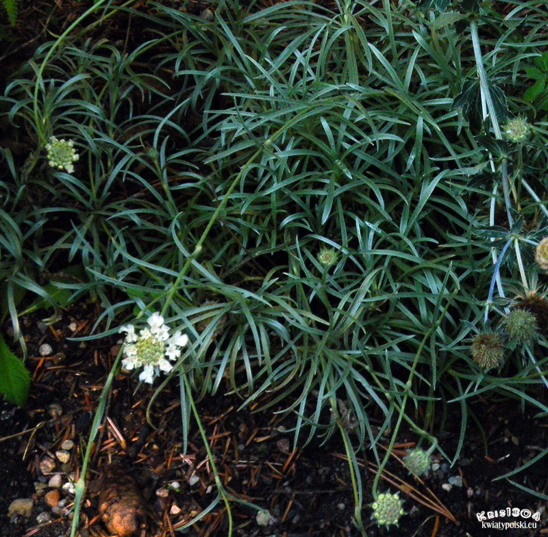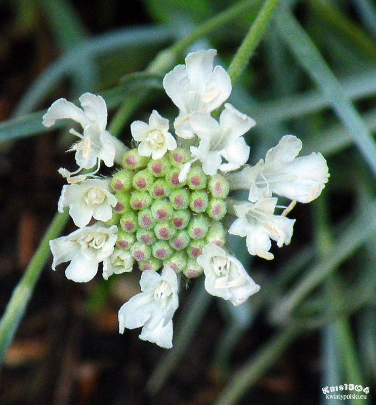 | OPIS | Kwiaty zebrane są w główkę wyrastającą na długiej szypułce na szczycie łodygi, białe, czasem różowawe.