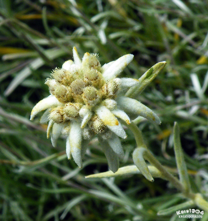 | OPIS | Kwiaty występują w kulistych kwiatostanach na szczytach łodyg o średnicy 2 cm. Kwiatostany są otoczone biało-wełnistymi liśćmi tworzącymi jakby rozetę. Kwiaty białe, brązowiejące z czasem.