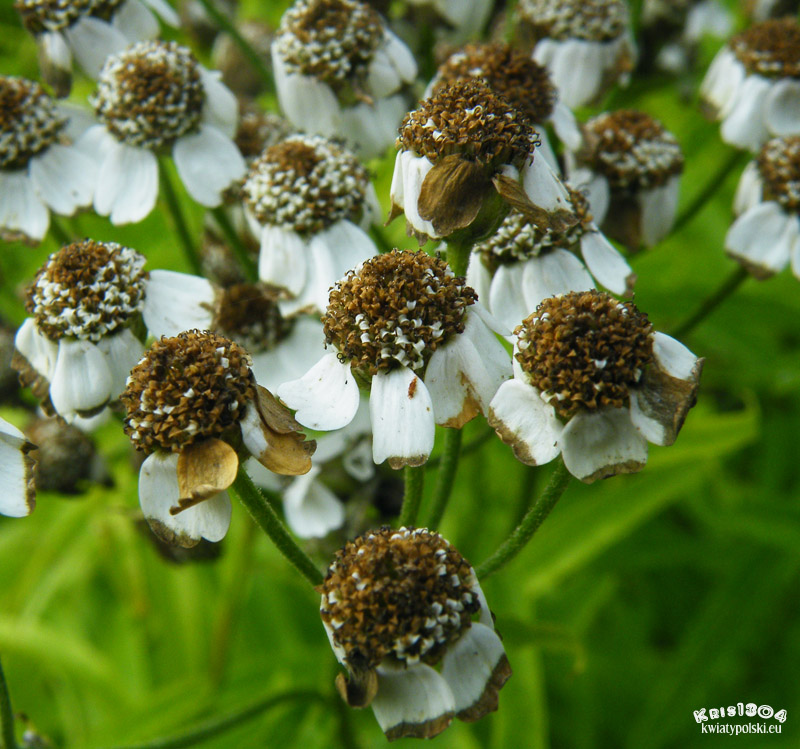| OPIS | Kwiaty zebrane w kwiatostany w postaci podbaldachu utworzonego przez liczne koszyczki. Kwiaty wewnętrzne obupłciowe, rurkowate, brzeżne natomiast to kwiaty żeńskie, języczkowe.