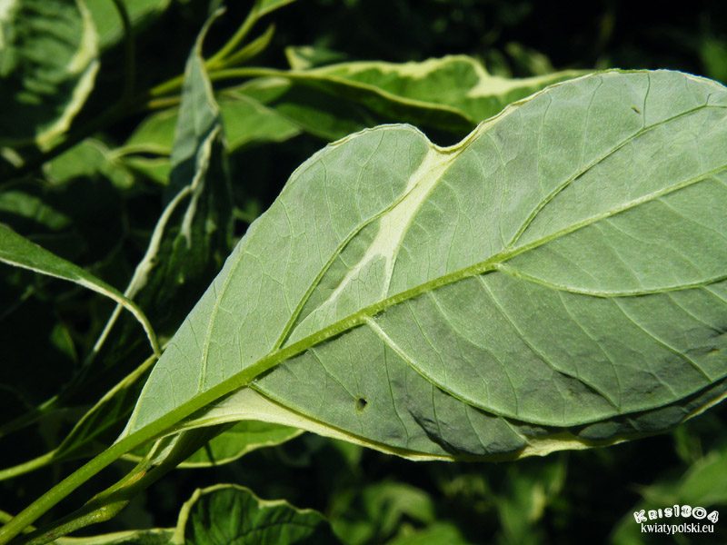 | LIŚCIE | Liście intensywnie zielone, pstre, z dużym, nieregularnym, białym obrzeżeniem, jajowate, średniej wielkości, lekko pomarszczone, Wczesną jesienią ogonki liściowe czerwienieją.