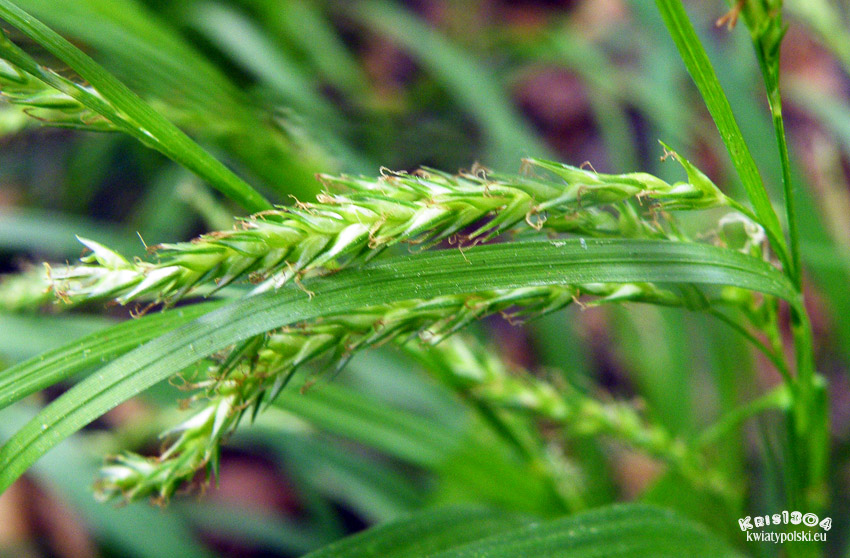 | OPIS | Kwiatostany złożone z 3-8 luźnych kłosów, na szczycie łodygi znajduje się pojedynczy lub podwójny kłos męski, wąski, koloru czerwono-brązowego o długości od 8 do 14 mm. Kłosy żeńskie w ilości od 2 do 6 umieszczone są niżej, nieco oddalone od męskich. Mają kolor zielony do brązowo-pomarańczowego i długość od 2 do 6 cm. Zwisają podczas owocowania na długich od 5 do 25 cm szypułkach.