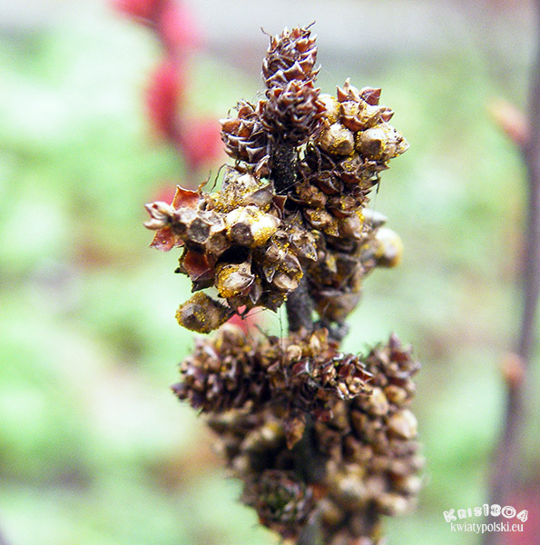 | OWOCE | Drobny, suchy orzeszek o długości 2,5 do 3 mm, spłaszczony, z trwałymi, gąbczastymi przysadkami tworzącymi dwa skrzydełka. Jest kropkowany gruczołowato i pokryty woskiem.