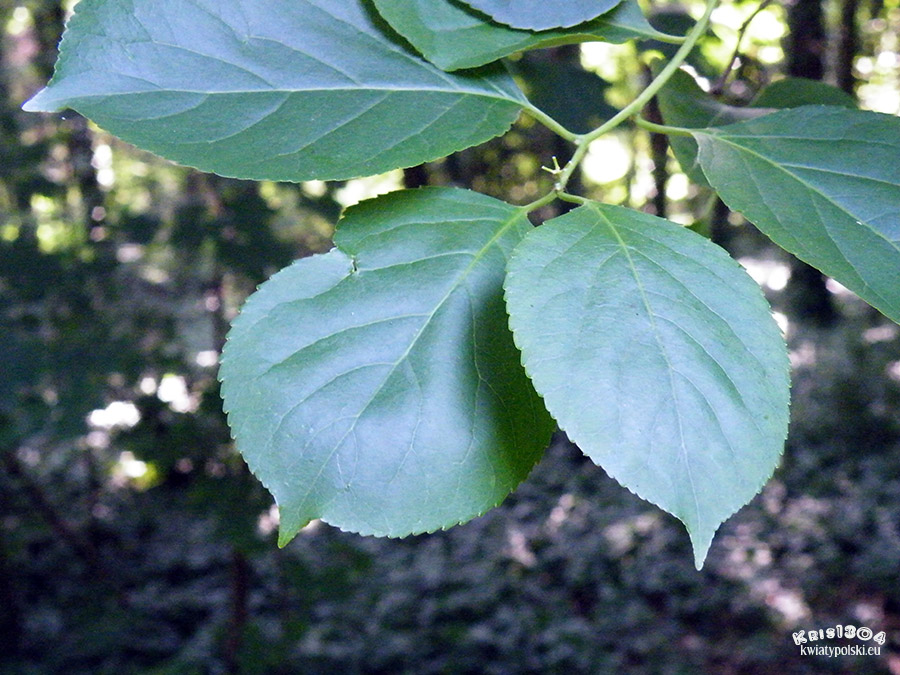 | LIŚCIE | Pojedyncze, szerokoodwrotnie-jajowate, także okrągławe z lekko wyciągniętym zaostrzonym wierzchołkiem, długość liścia waha się pomiędzy 5-10 cm, brzeg liścia najczęściej karbowano-piłkowany.