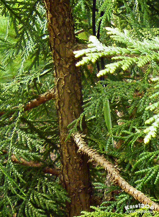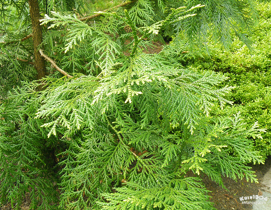| POKRÓJ | Drzewo o koronie stożkowatej i gęstej. W Europie do ok. 10-20 m. Gałązki ułożone w płaszczyźnie i podobne do żywotników, jednak bardziej tęgie, szersze i błyszczące.