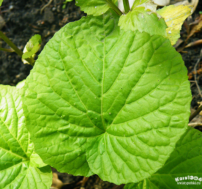 | LIŚCIE | Duże, zielone, okągławo-jajowate o brzegu falistym.