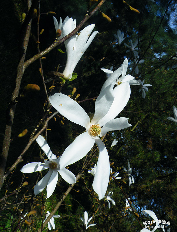 | OPIS | Kwiaty pojawiają się jeszcze przed liśćmi, silnie pachnące koloru białego. Siedmio płatkowe charakterystyczne dla magnolii.