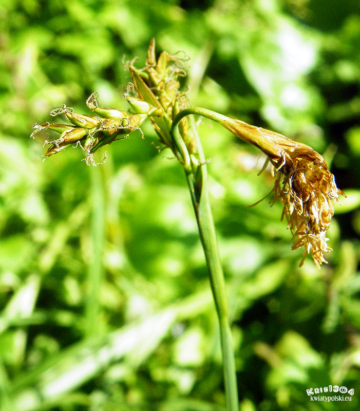 | OPIS | Na szczycie pędu kwiatowego występuje kłos męski, pozostałe boczne to kłosy żeńskie (1-3). Podsadki kłosów są liściowate i posiadają długie, rozdęte pochwy i krótkie blaszki. Przysadki są rdzawoczerwone z zielonym nerwem. Pęcherzyki są dłuższe od przysadek, kulistawojajowate, o długości ok. 4 mm, szarozielone, beznerwowe, z wyraźnym dwuząbkowym dzióbkiem.