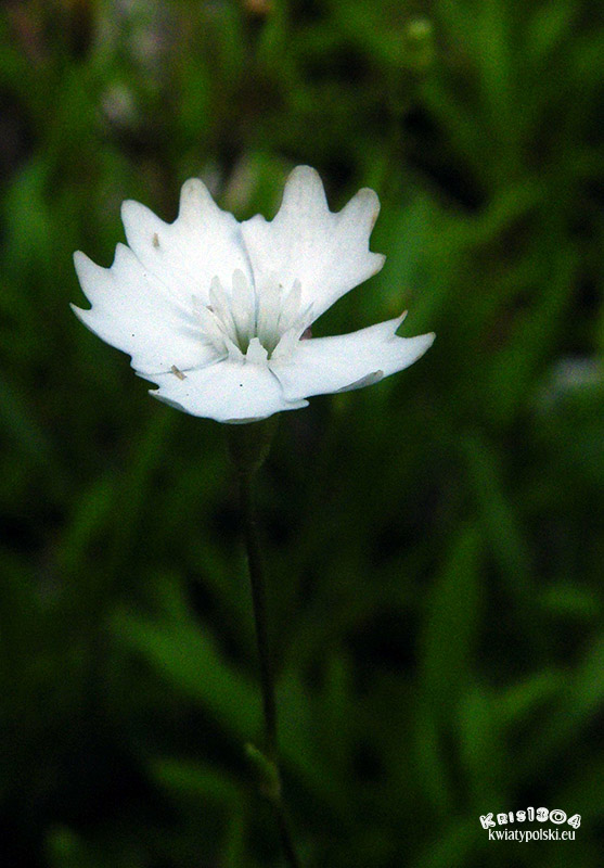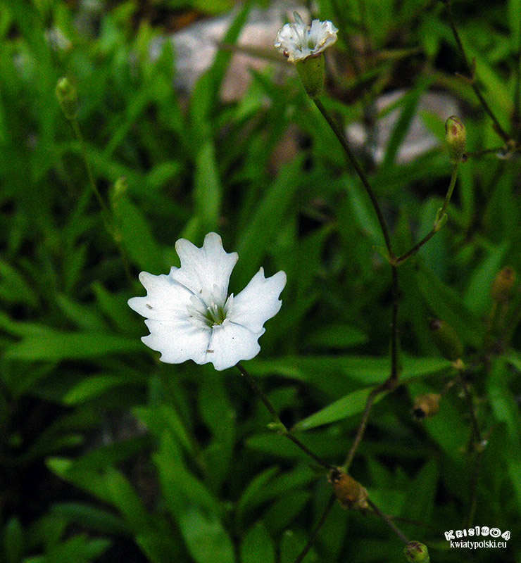 OPISU szczytu pędu na dość długich(jak na tak małą roślinkę) szypułkach pojawiają się pięciopłatkowe kwiaty. Średnica kwiatu do 2 cm. Pojedyncze płatki mają przeważnie 4 ząbki i jak na lepnicę stosunkowo mało rozdęty kielich. Kwiaty białe lub różowawe.