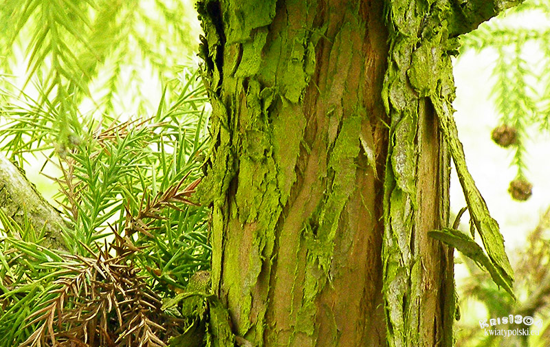 | KORA, PĘDY | Kora na pniu ma kolor czerwonobrązowy lub ciemnoszary i jest włóknista.