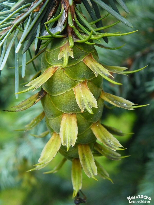 | OWOCE | Szyszki długości 5-10 cm, jasno brązowe, na krótkich trzoneczkach. Opadają w całości. Łuski wspierające (okrywające) bardzo charakterystyczne: długie, trójzębne, wystające daleko poza łuski nasienne, odstające lub nawet mocno odwinięte na zewnątrz.