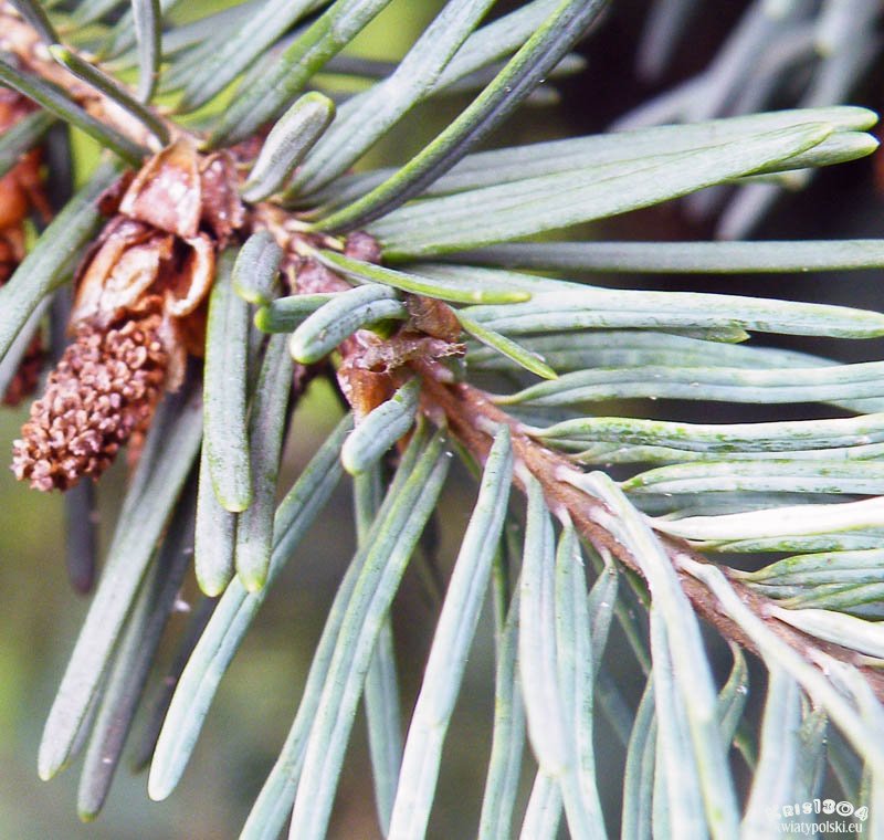 | LIŚCIE | Igły długości od 2 do 3,5 cm. Z wierzchu jasnozielone i połyskujące, od spodu z wyraźnymi, jaśniejszymi paskami woskowego nalotu. Grzebieniasto umiejscowione. Po roztarciu pachną cytrusami.