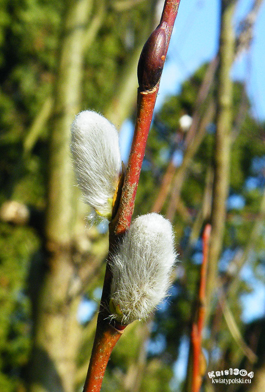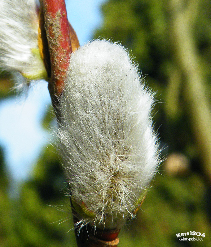 | OPIS | Roślina dwupienna. Kwiaty zebrane w kotki o dwubarwnych przysadkach; dołem jasnych, lub czerwonawych, górą czarniawych. Kotki bez szypułek, o szerokojajowatych przysadkach, duże, zwykle po kilka razem. W kwiatach żeńskich słupki siedzące, lub na bardzo krótkich trzonkach, zalążnia słupka przylegająco, gęsto owłosiona, znamię dwudzielne, krótsze od szyjki i wyraźnie łukowato rozchylone. Kotki męskie bezszypułkowe, o szerokości ok. 17 mm i długości do 5 cm, o przysadkach owłosionych głównie na brzegach. Młode kotki całkowicie otulone białymi, jedwabistymi włosami. Kwiaty męskie z 1 wydłużonym miodnikiem, o pręcikach różnej długości, z wolnymi nitkami i żółtymi pylnikami.