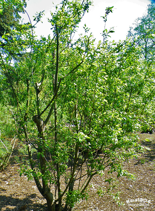 | KORA, PĘDY | Kora ma szarą barwę. Jest relatywnie lekko spękana. Roczne gałązki obłe i długie, połyskujące, owłosione, koloru od zielonego do brązowego, później fioletowoszarego. Starsze gałęzie grube i kruche, pokryte sinoniebieskim woskowym nalotem. Pąki są wypukłe, duże i zaostrzone. Mają ciemnoczerwoną barwę i są błyszczące.
