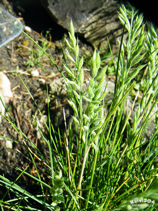 | OPIS | Kwiaty zebrane w szorstką wiechę o gładkich i wzniesionych gałązkach podstawowych. Jej kłoski mają długość do 9 mm, są 3-5 kwiatowe i zazwyczaj fioletowo nabiegłe. Dolna plewka ma długość do 5 mm, jest bezostna, na szczycie błoniasta i przeważnie postrzępiona. Słupek gęsto owłosiony.