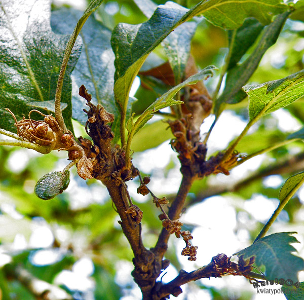 | OWOCE | Żołędzie dojrzewają dopiero w drugim roku. Owalne, 2,5 cm długości, brązowe osadzone w zdrewniałej miseczce pokrytej włosowatymi łuskami.