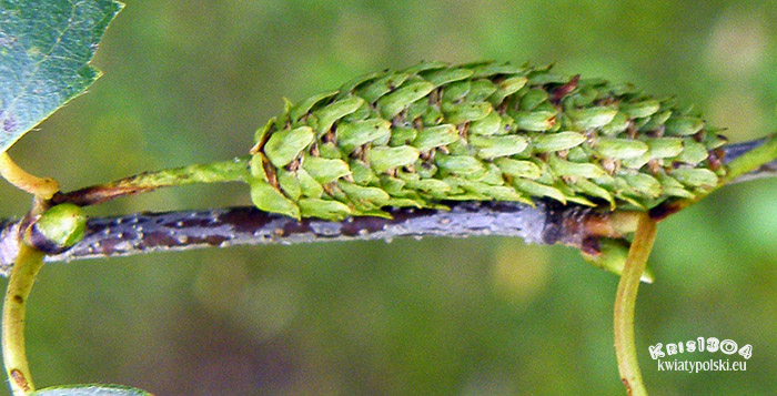| OPIS | Żeński kwiatostan wyprostowany lub rozpostarty, podłużny lub podłużno-cylindryczny. Szypułka owłosiona, przylistki orzęsione, 3-klapowe, środkowy płat podłużny, boczne płaty rozchylające się.