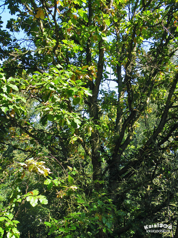 | LIŚCIE | Odwrotnie jajowate, mają zmienny kształt oraz klinowatą nasadę. Czasami bywają tylko pofalowane na brzegu. Mają długość do 18 cm. Jesienią zmieniają barwę na pomarańczowoczerwoną. Liście są biało owłosione od spodu.