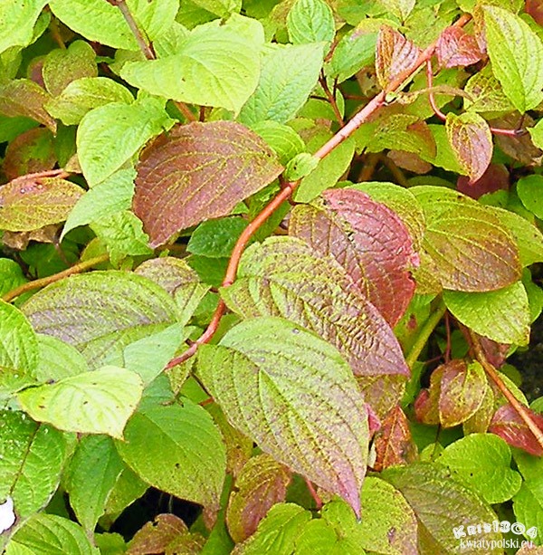 3)`Sibirica` - o intensywnie koralowoczerwonych pędach i liściach zielonych, jesienią przebarwiających się na czerwonobrunatno