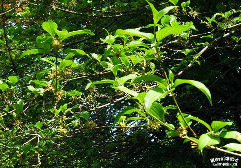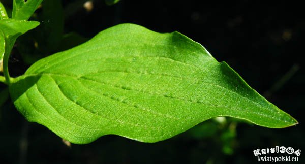 | LIŚCIE | Blaszkowate, pojedyncze. Blaszka szeroko eliptyczno lub jajowata, zaostrzona, długości do 4-8 cm (liście szczytowe większe od niżej położonych), całobrzega, obustronnie zielona (jednak od spodu nieco jaśniejsza), bardzo lekko i rzadko owłosiona, bez kępek włosków w kątach nerwów (różnica w stosunku do derenia jadalnego), jej charakterystyczną cechą jest łukowata nerwacja z 3-5 parami jasnych, mocno wystających od spodu nerwów. Ustawienie naprzeciwległe na ok. 1cm, rynienkowatych ogonkach.