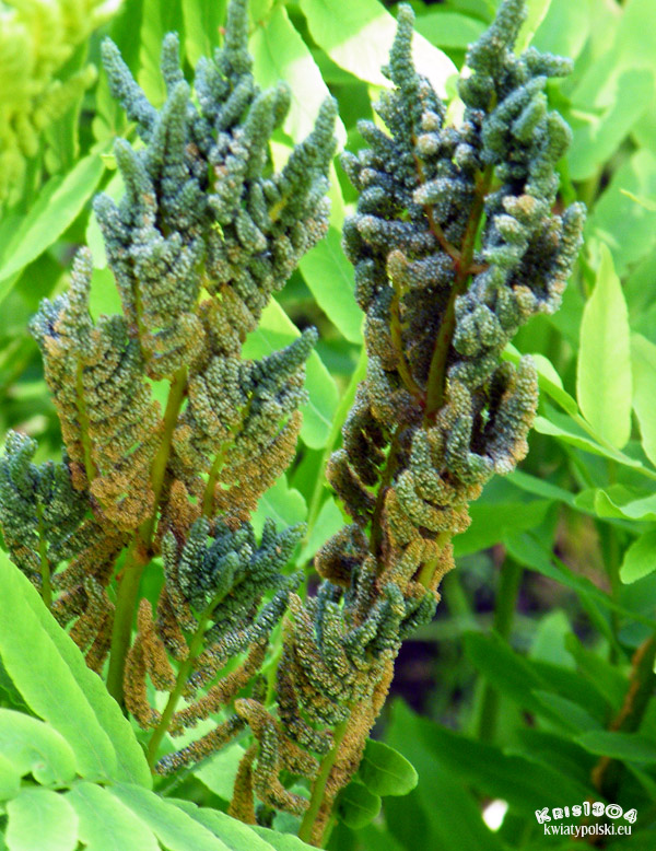 | LIŚCIE | Po rozwinięciu są nagie, skórzaste, cienkie i prześwitujące. Blaszka liściowa jest owalna lub podłużnie jajowata. Poza liśćmi asymilacyjnymi wykształcają się też liście podzielone na część asymilującą i część służącą rozmnażaniu. Dolna, asymilacyjna część podwójniepierzastych liści ma podłużne, zielone listki z zaokrąglonym szczytem, brzegiem falisto karbowane. Odcinki górnej części liścia są przekształcone w liczne sporangiofory, na brzegach których powstają zarodniki ułożone kłosowato. W dojrzałym stadium górna część liścia przybiera barwę rdzawobrunatną.
