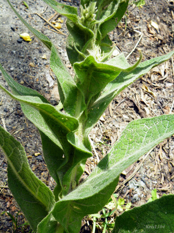 | UWAGI | W pierwszym roku wykształca przyziemną rozetę okazałych liści osiągających do 0,5 m długości. W drugim roku wyrasta prosty, wzniesiony pęd osiągający 1-2 m wysokości. W dolnej części gęsto ulistniony, w górnej zwieńczony długim kwiatostanem. Wszystkie organy wegetatywne rośliny oraz kielichy kwiatów i owoce pokryte są gęstymi, gwiazdkowatymi włoskami.