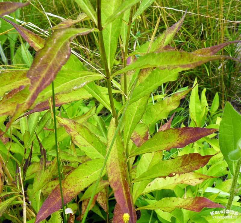 | LIŚCIE | Liście dolne nakrzyżległe, górne skrętoległe, prawie siedzące, jajowatolancetowate, zaostrzone, długości do 12 cm.